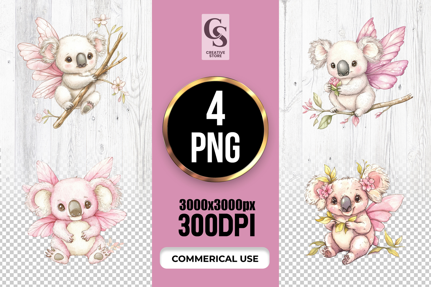 4 Pink Fairy Koala Watercolor Clipart Sublimation PNG Files Perfect for Greeting Cards, Invitations, Junk Journal, Party Decor, Scrapbooking and many other craft projects .