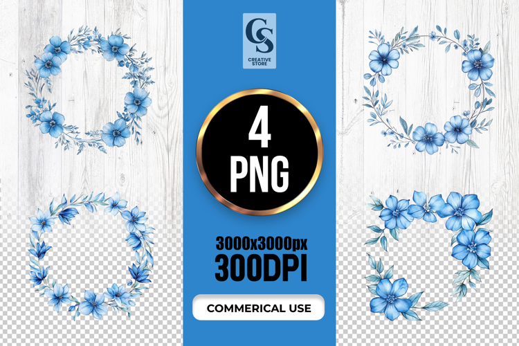 4 Blue Floral Wreath Clipart Sublimation PNG Files Perfect for Greeting Cards, Invitations, Junk Journal, Party Decor, Scrapbooking and many other craft projects .
