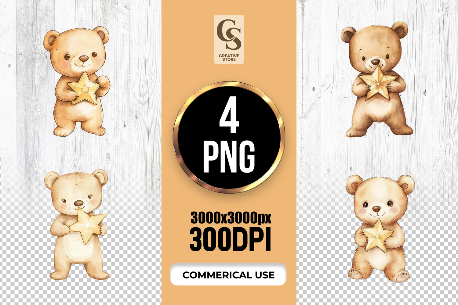 4 Watercolor Teddy Bear Holding Star Clipart Sublimation PNG Files Perfect for Greeting Cards, Invitations, Junk Journal, Party Decor, Scrapbooking and many other craft projects .