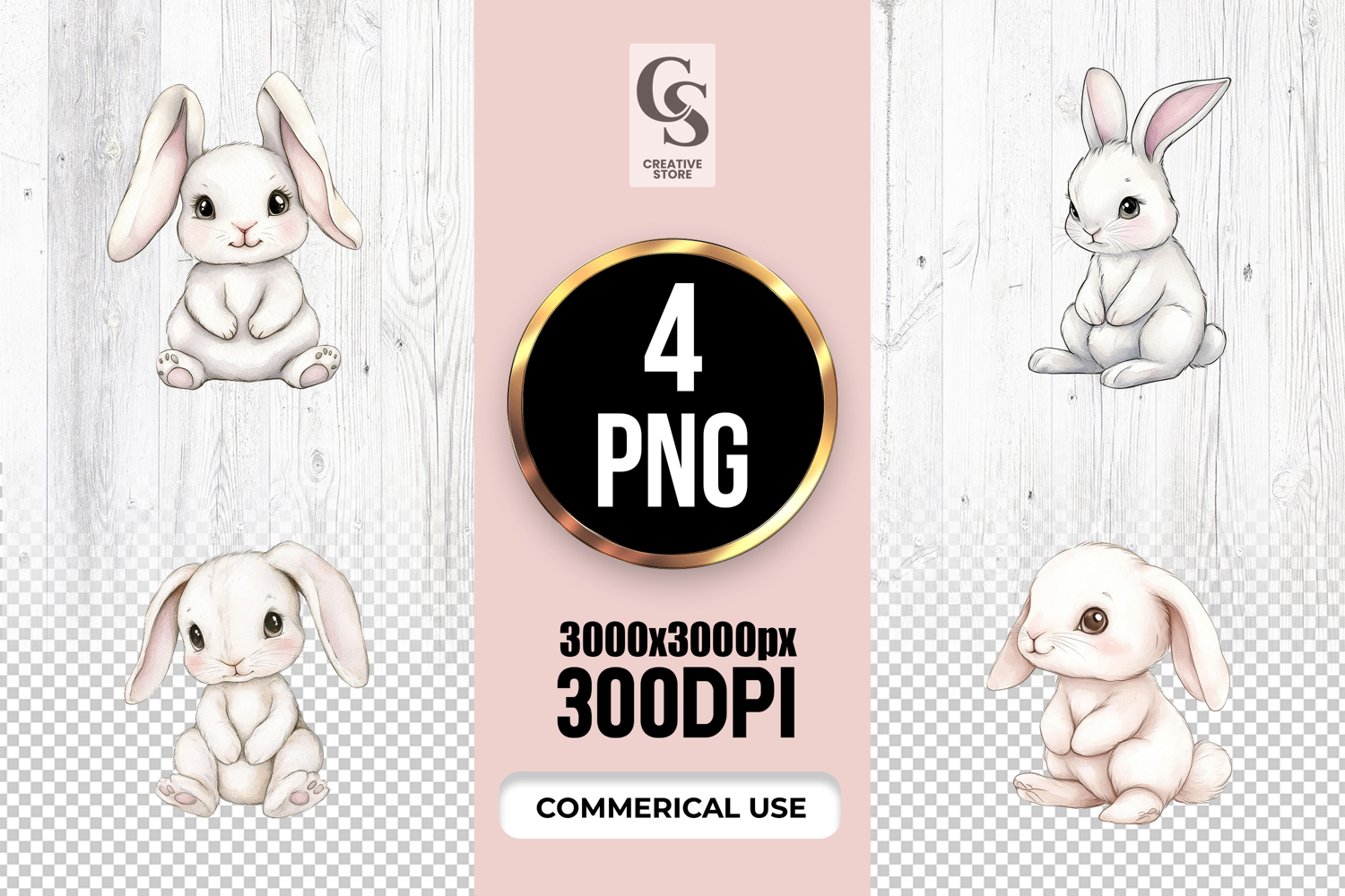 4 Cute Baby Bunny Watercolor Clipart Sublimation PNG Files Perfect for Greeting Cards, Invitations, Junk Journal, Party Decor, Scrapbooking and many other craft projects .