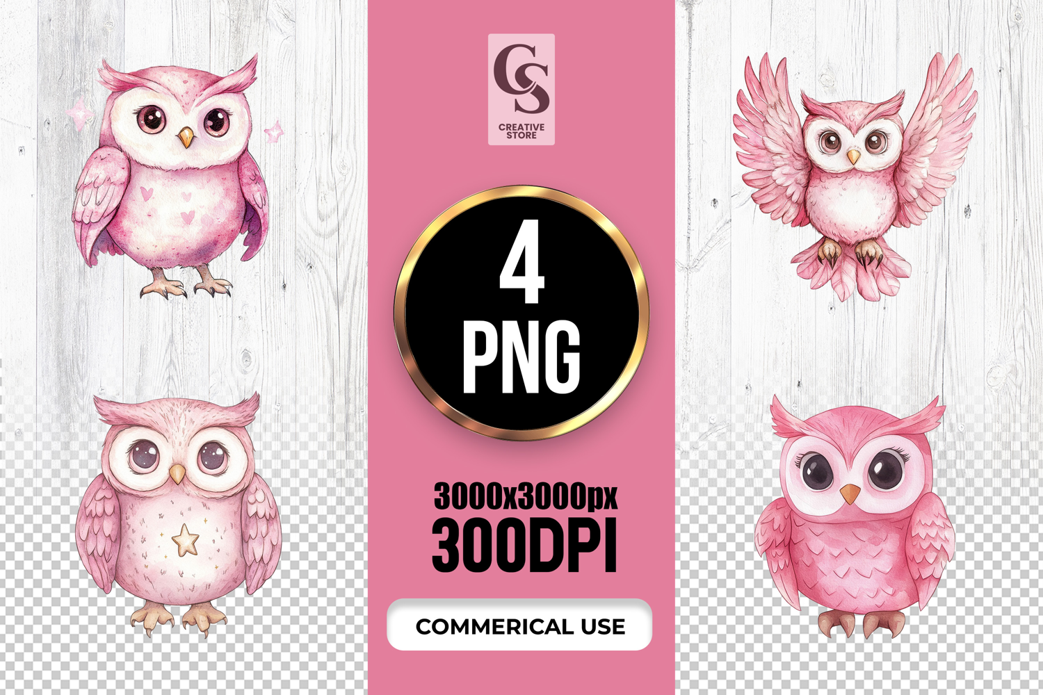 4 Cute Pink Owl Watercolor Clipart Sublimation PNG Files Perfect for Greeting Cards, Invitations, Junk Journal, Party Decor, Scrapbooking and many other craft projects .