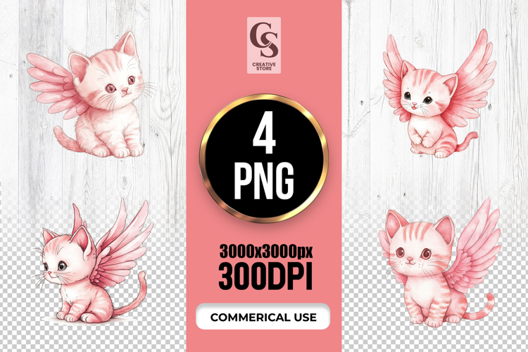 4 Cute Pink Angel Kitten Watercolor Clipart Sublimation PNG Files Perfect for Greeting Cards, Invitations, Junk Journal, Party Decor, Scrapbooking and many other craft projects .