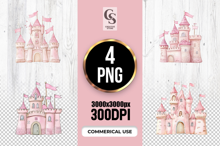 4 Pink Fairytale Princess Castle Clipart Sublimation PNG Files Perfect for Greeting Cards, Invitations, Junk Journal, Party Decor, Scrapbooking and many other craft projects .