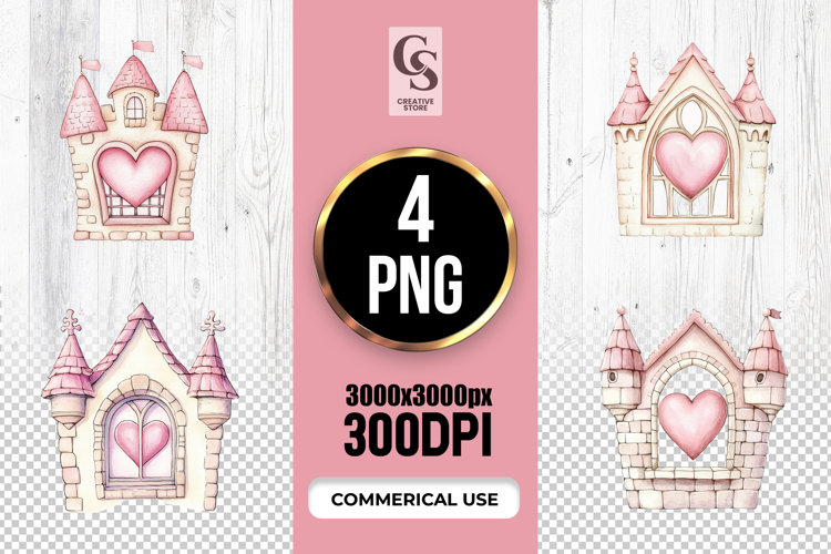 4 Watercolor Heart Castle Window Clipart Sublimation PNG Files Perfect for Greeting Cards, Invitations, Junk Journal, Party Decor, Scrapbooking and many other craft projects .