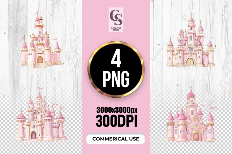 4 Watercolor Pink Royal Castle Clipart Sublimation PNG Files Perfect for Greeting Cards, Invitations, Junk Journal, Party Decor, Scrapbooking and many other craft projects .