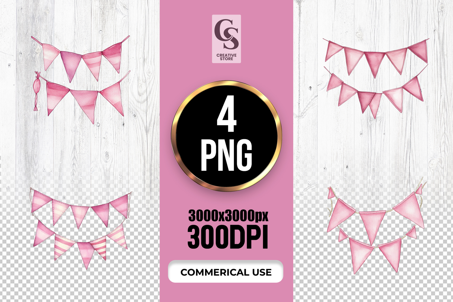 4 Pink Bunting Banner Clipart Sublimation PNG Files Perfect for Greeting Cards, Invitations, Junk Journal, Party Decor, Scrapbooking and many other craft projects .