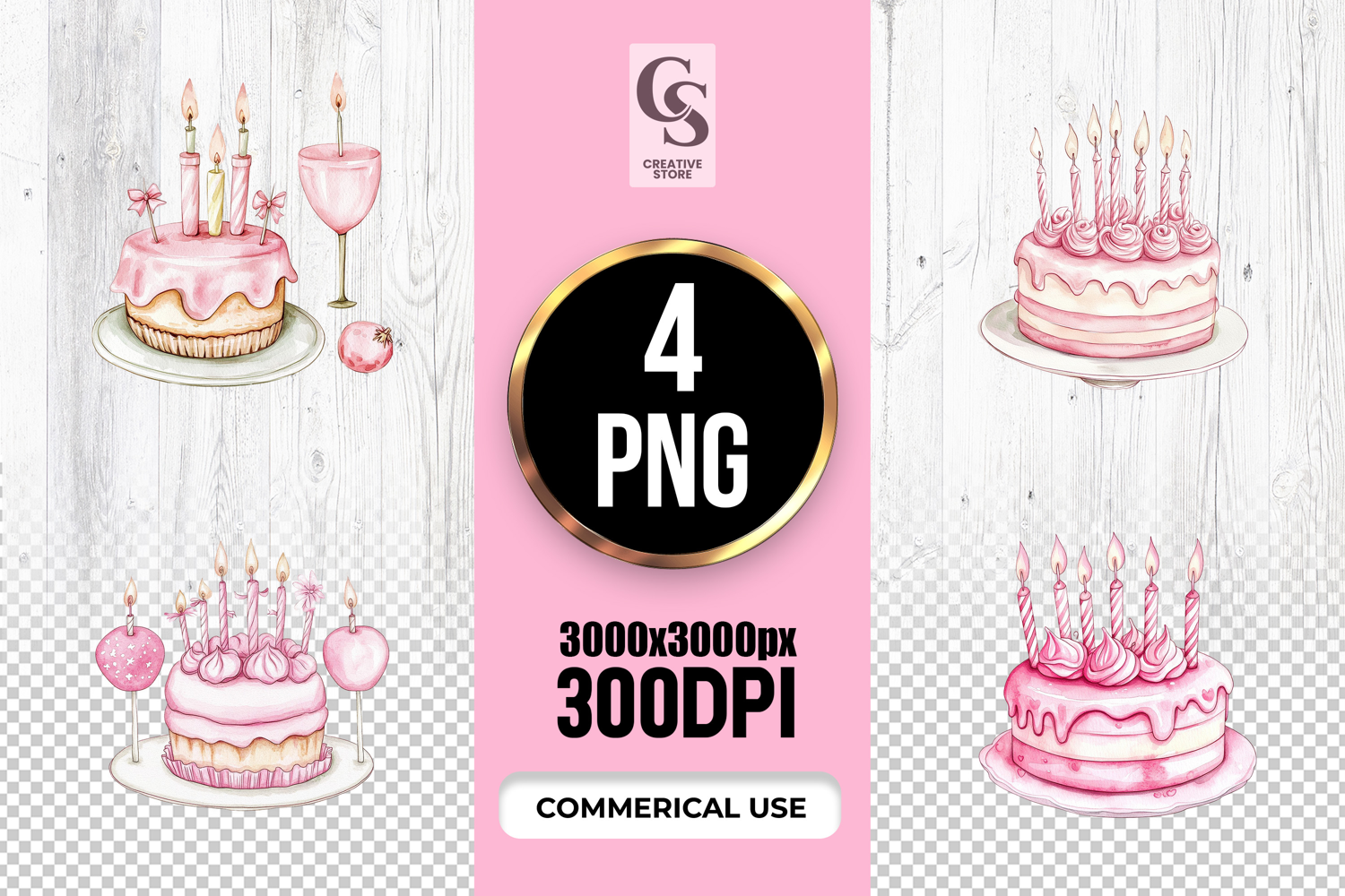 4 Pink Celebration Cake Clipart Sublimation PNG Files Perfect for Greeting Cards, Invitations, Junk Journal, Party Decor, Scrapbooking and many other craft projects .
