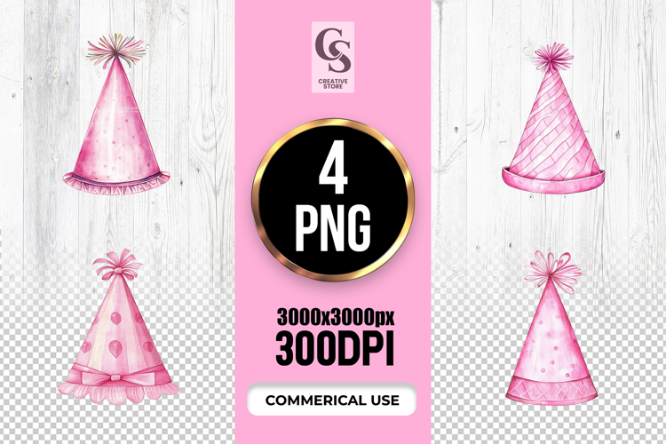 4 Pink Party Hat Clipart Sublimation PNG Files Perfect for Greeting Cards, Invitations, Junk Journal, Party Decor, Scrapbooking and many other craft projects .