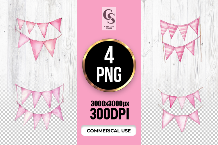 4 Pink Party Bunting Banner Clipart Sublimation PNG Files Perfect for Greeting Cards, Invitations, Junk Journal, Party Decor, Scrapbooking and many other craft projects .