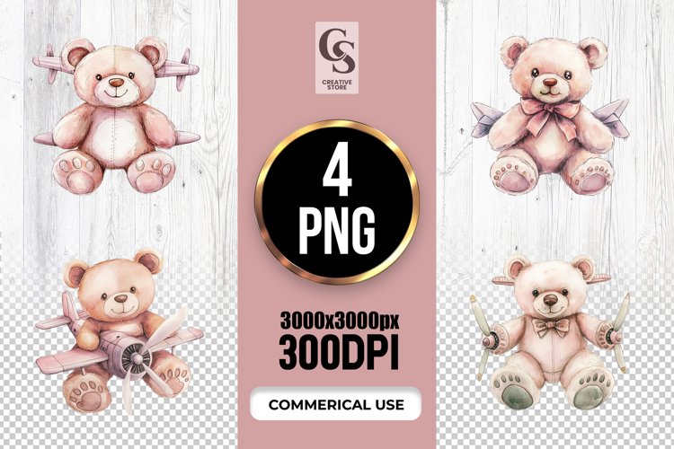 4 Vintage Teddy Bear Airplane Clipart Sublimation PNG Files Perfect for Greeting Cards, Invitations, Junk Journal, Party Decor, Scrapbooking and many other craft projects .