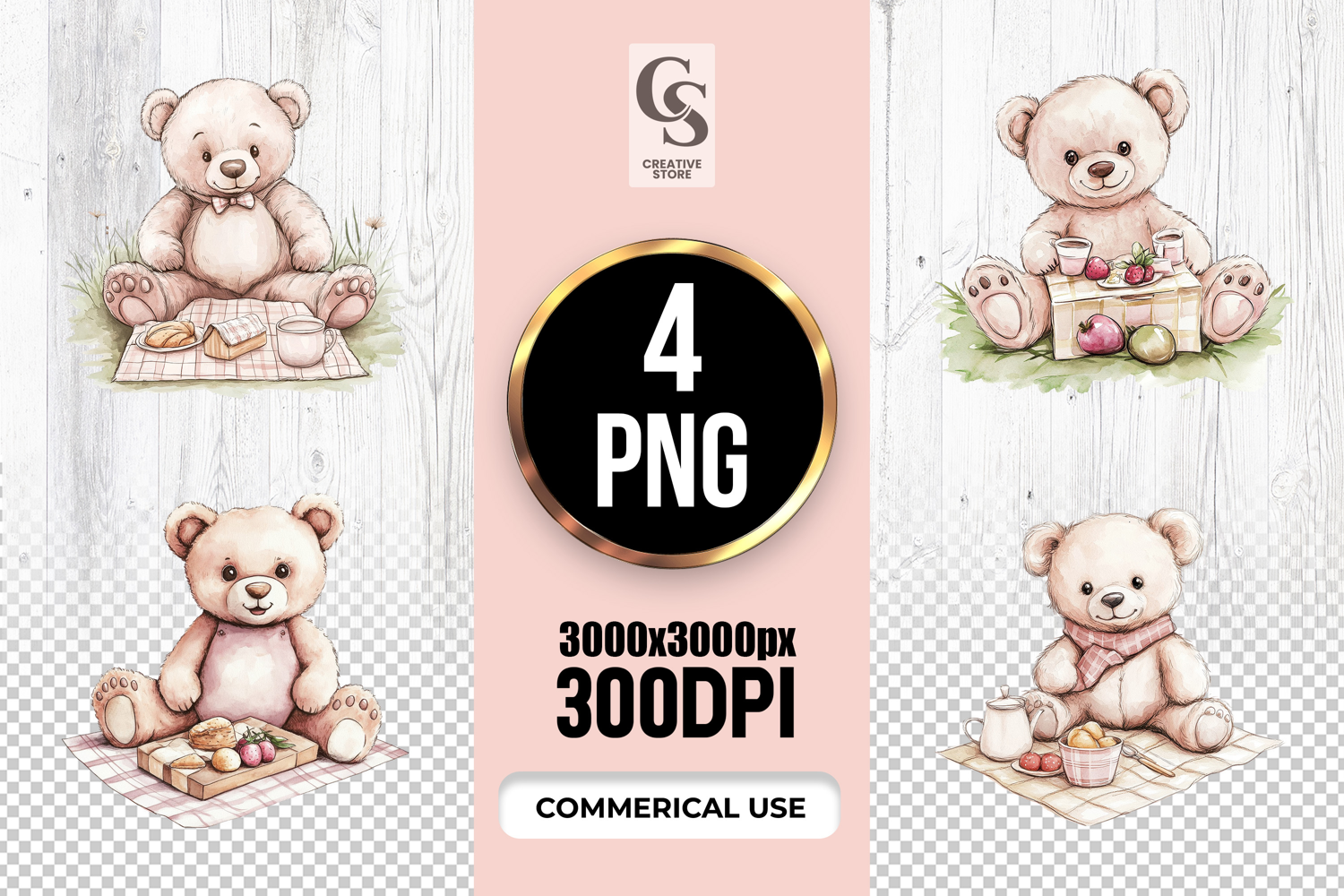 4 Watercolor Teddy Bear Picnic Clipart Sublimation PNG Files Perfect for Greeting Cards, Invitations, Junk Journal, Party Decor, Scrapbooking and many other craft projects .
