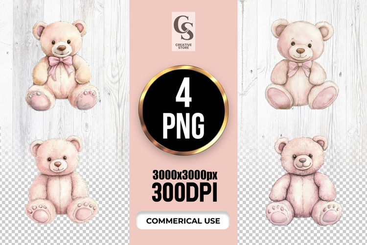 4 Watercolor Teddy Bear Clipart Sublimation PNG Files Perfect for Greeting Cards, Invitations, Junk Journal, Party Decor, Scrapbooking and many other craft projects .