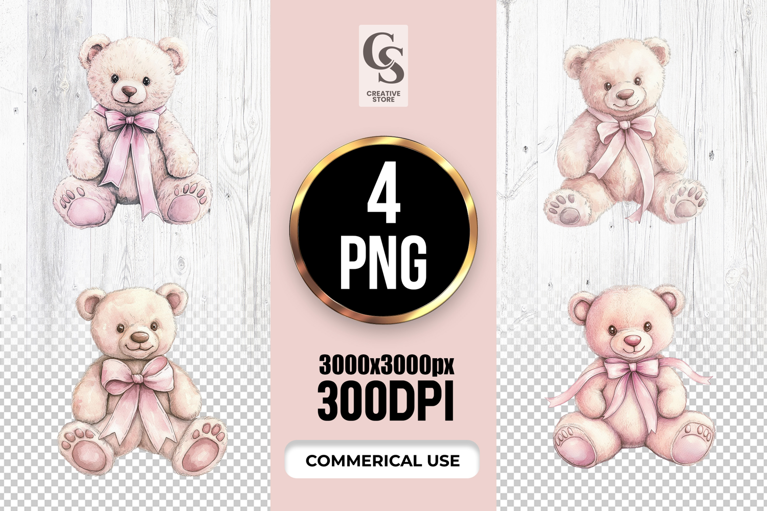 4 Watercolor Teddy Bear Bow Clipart Sublimation PNG Files Perfect for Greeting Cards, Invitations, Junk Journal, Party Decor, Scrapbooking and many other craft projects .