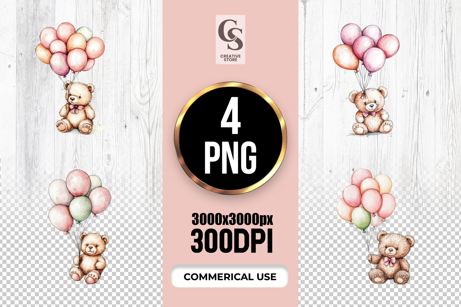 4 Watercolor Teddy Bear Balloons Clipart Sublimation PNG Files Perfect for Greeting Cards, Invitations, Junk Journal, Party Decor, Scrapbooking and many other craft projects .