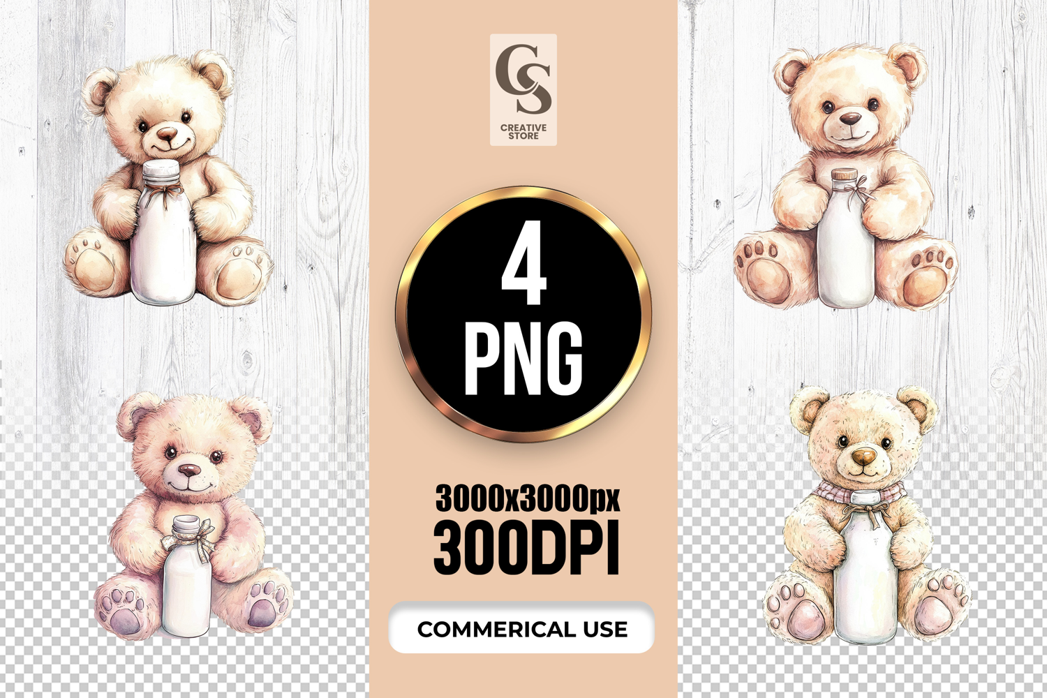 4 Watercolor Teddy Bear With Milk Bottle Clipart PNG Files Perfect for Greeting Cards, Invitations, Junk Journal, Party Decor, Scrapbooking and many other craft projects .
