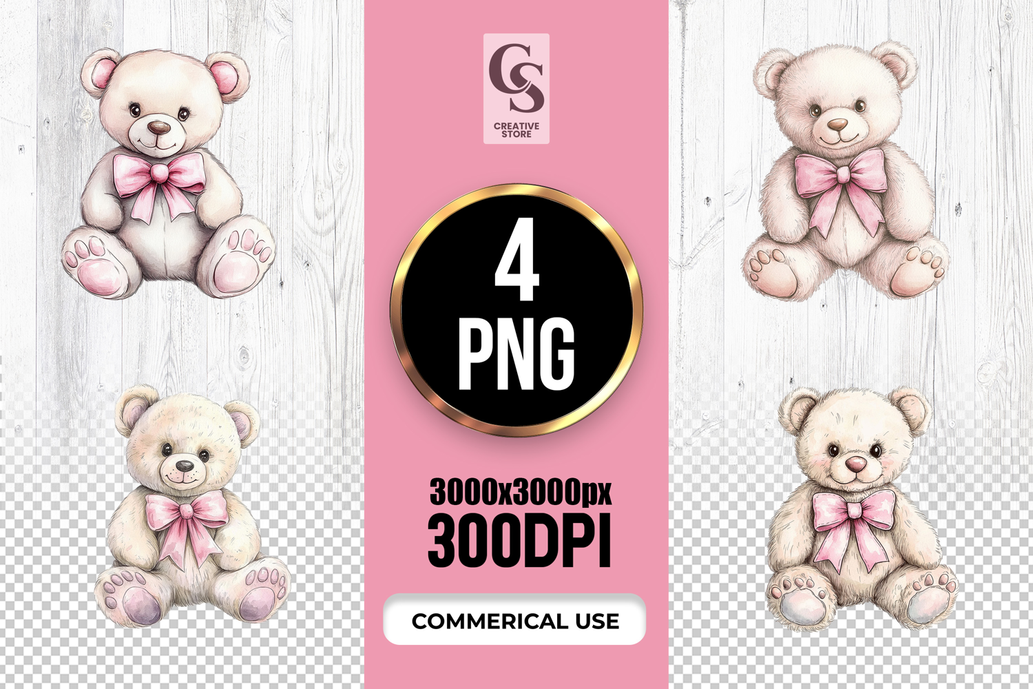 4 Watercolor Teddy Bear With Pink Bow Clipart Sublimation PNG Files Perfect for Greeting Cards, Invitations, Junk Journal, Party Decor, Scrapbooking and many other craft projects .