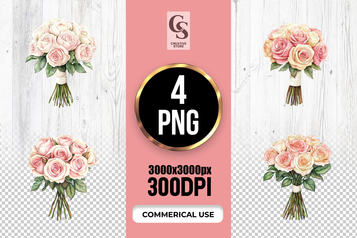 4 Watercolor Pink Rose Bouquet Clipart PNG Files Perfect for Greeting Cards, Invitations, Junk Journal, Party Decor, Scrapbooking and many other craft projects .