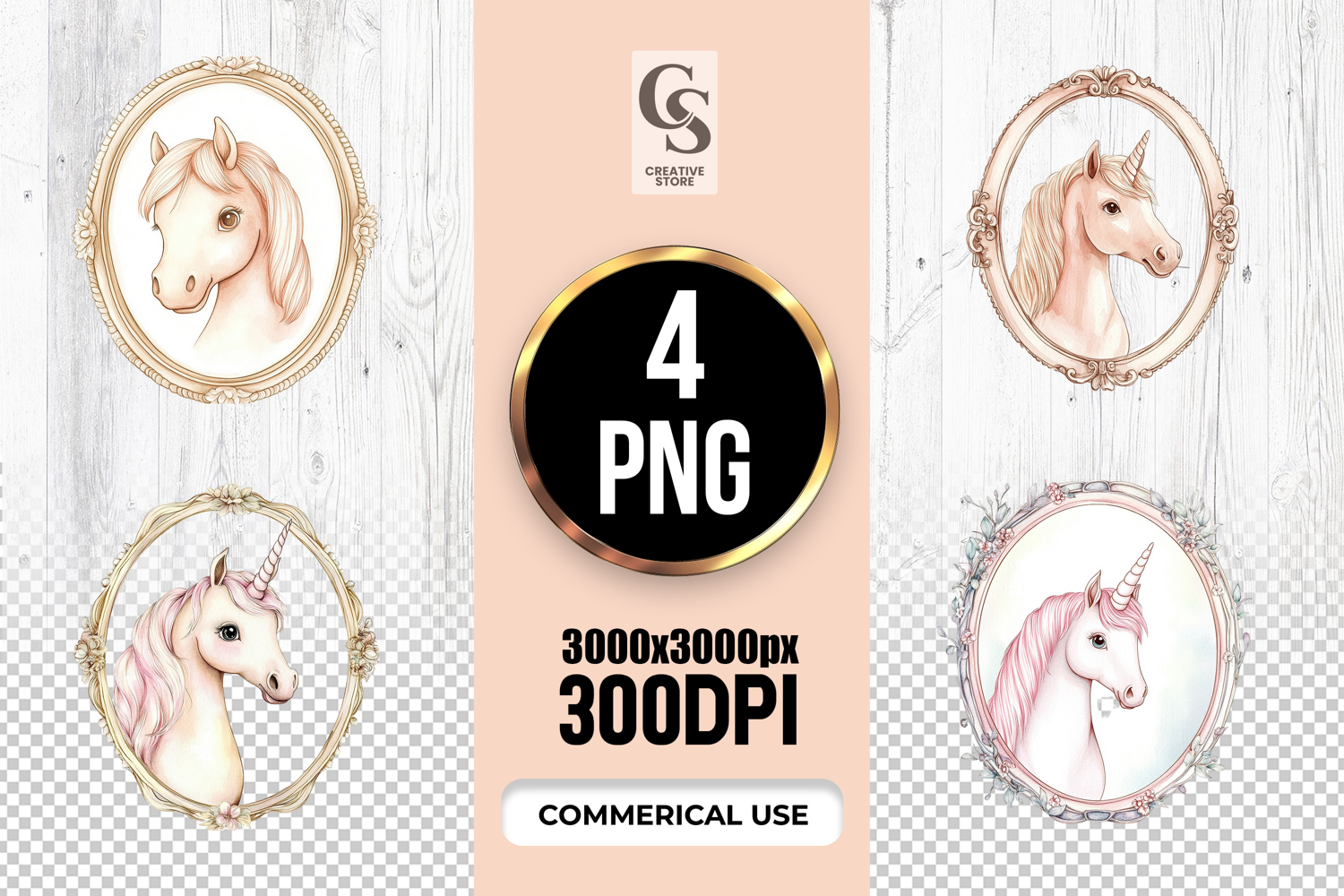 4 Vintage Unicorn Frame Clipart Sublimation PNG Files Perfect for Greeting Cards, Invitations, Junk Journal, Party Decor, Scrapbooking and many other craft projects .