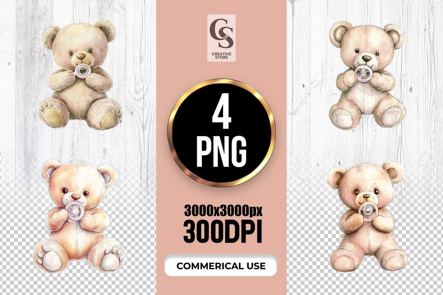 4 Cute Baby Teddy Bear Pacifier Clipart PNG Files Perfect for Greeting Cards, Invitations, Junk Journal, Party Decor, Scrapbooking and many other craft projects .