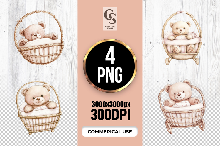 4 Baby Teddy Bear Basket Clipart PNG Files Perfect for Greeting Cards, Invitations, Junk Journal, Party Decor, Scrapbooking and many other craft projects .
