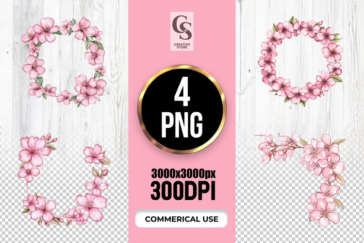 4 Pink Floral Wreath Clipart Sublimation PNG Files Perfect for Greeting Cards, Invitations, Junk Journal, Party Decor, Scrapbooking and many other craft projects .