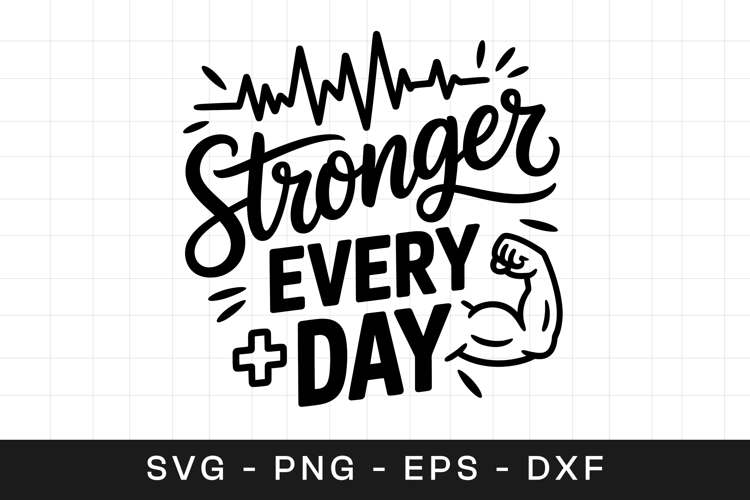 Stronger Every Day Quote SVG design. Perfect for crafters, designers, and DIY lovers, this design works beautifully with cutting machines and design software. Use this inspirational quote for greeting cards, invitations, scrapbooking, junk journals, party decor, t-shirts, mugs, wall art, stickers, and many other craft projects.