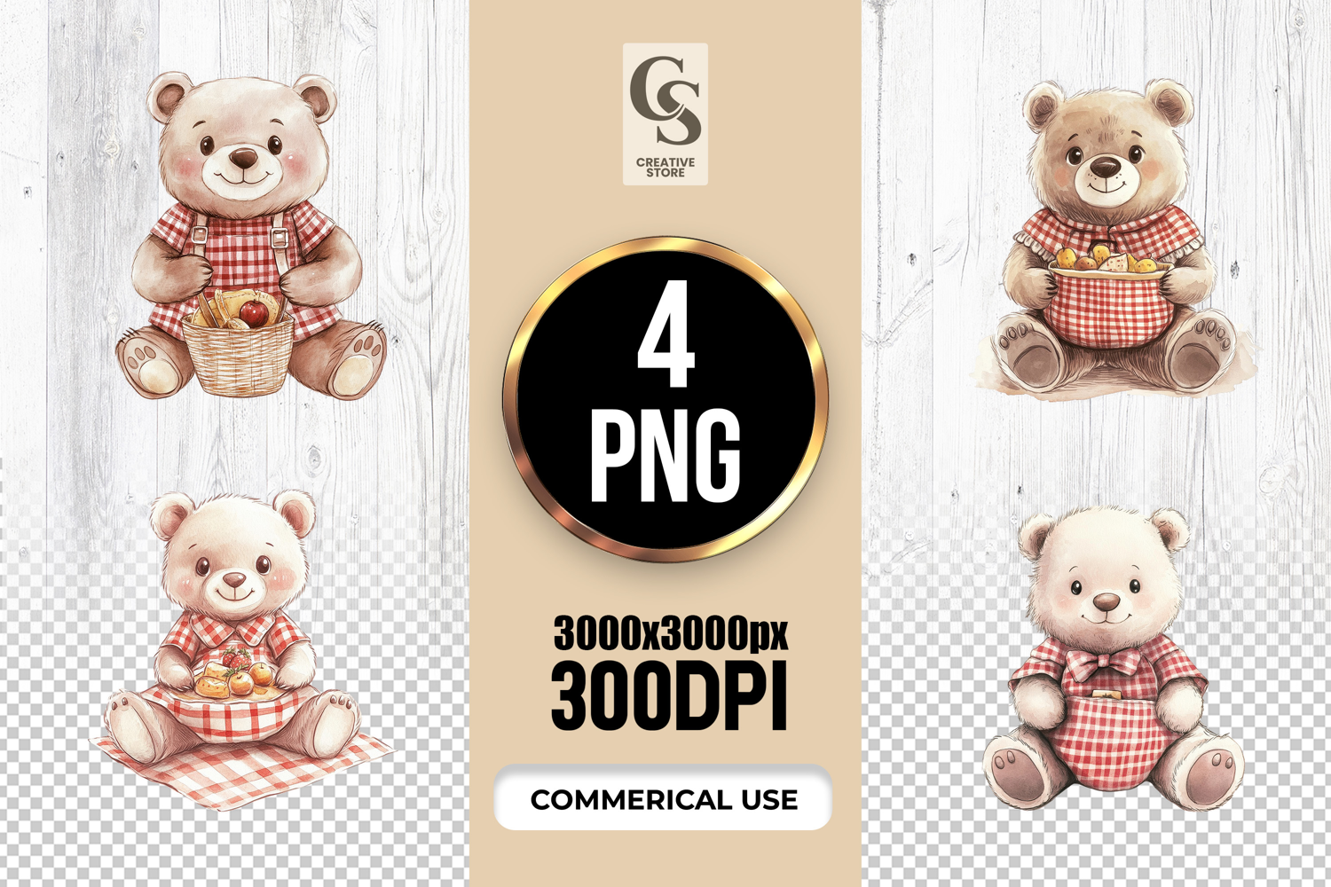 4 Cute Teddy Bear Picnic Clipart Sublimation PNG Files Perfect for Greeting Cards, Invitations, Junk Journal, Party Decor, Scrapbooking and many other craft projects .