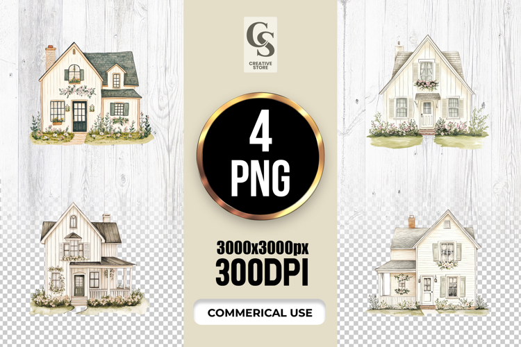4 Charming Country House Illustration Clipart Sublimation PNG Files Perfect for Greeting Cards, Invitations, Junk Journal, Party Decor, Scrapbooking and many other craft projects .