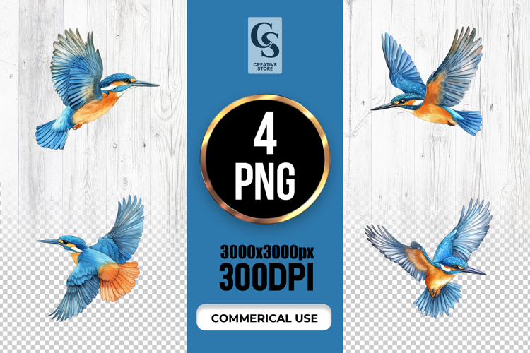 4 Flying Kingfisher Bird Illustration Clipart Sublimation PNG Files Perfect for Greeting Cards, Invitations, Junk Journal, Party Decor, Scrapbooking and many other craft projects .