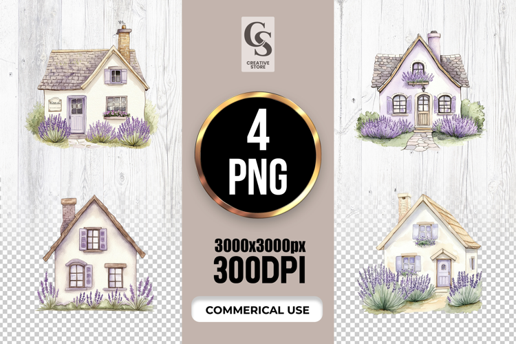 4 Lavender Cottage House Illustration Clipart Sublimation PNG Files Perfect for Greeting Cards, Invitations, Junk Journal, Party Decor, Scrapbooking and many other craft projects .