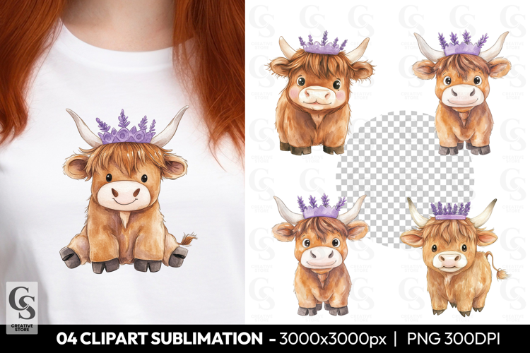 4 Highland Cow With Lavender Crown Clipart Sublimation PNG Files Perfect for Greeting Cards, Invitations, Junk Journal, Party Decor, Scrapbooking and many other craft projects .