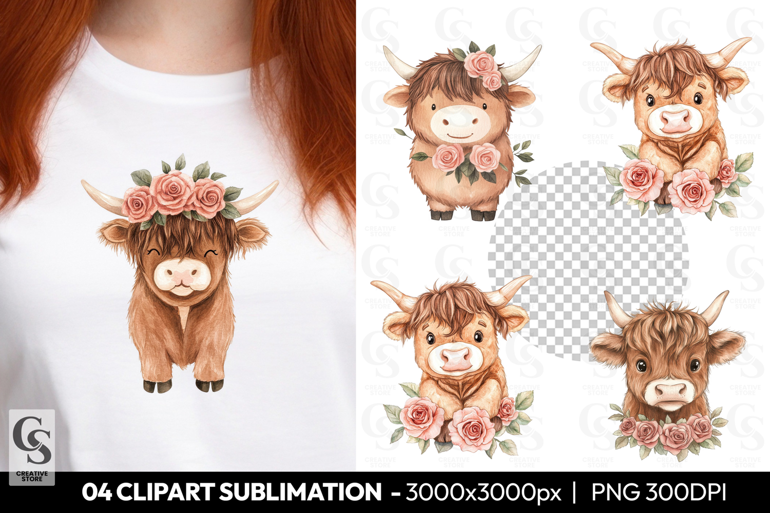 4 Highland Cow With Rose Crown Clipart Sublimation PNG Files Perfect for Greeting Cards, Invitations, Junk Journal, Party Decor, Scrapbooking and many other craft projects .