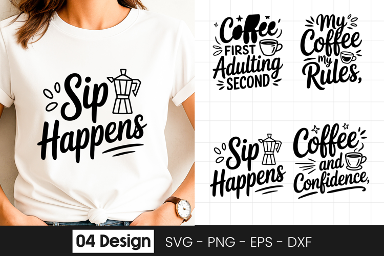 Sip Happens Funny Coffee Quote SVG PNG Perfect for crafters, designers, and DIY lovers, this design works beautifully with cutting machines and design software. Use this inspirational quote for greeting cards, invitations, scrapbooking, junk journals, party decor, t-shirts, mugs, wall art, stickers, and many other craft projects.