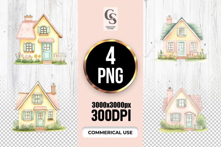 4 Pastel Cottage House Watercolor Clipart Sublimation PNG Files Perfect for Greeting Cards, Invitations, Junk Journal, Party Decor, Scrapbooking and many other craft projects
