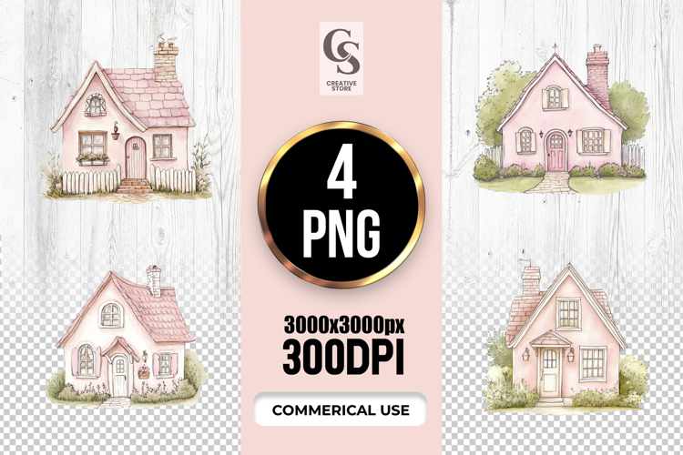 4 Pink Cottage House Watercolor PNG Files Perfect for Greeting Cards, Invitations, Junk Journal, Party Decor, Scrapbooking and many other craft projects