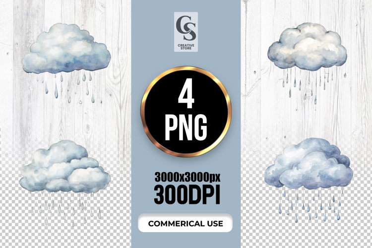 4 Rain Cloud Watercolor Clipart PNG Files Perfect for Greeting Cards, Invitations, Junk Journal, Party Decor, Scrapbooking and many other craft projects
