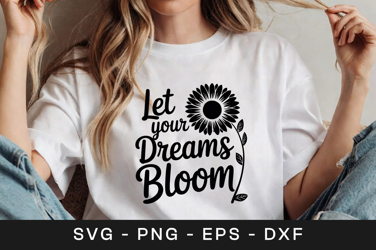 Let Your Dreams Bloom Sunflower SVG PNG Perfect for crafters, designers, and DIY lovers, this design works beautifully with cutting machines and design software. Use this inspirational quote for greeting cards, invitations, scrapbooking, junk journals, party decor, t-shirts, mugs, wall art, stickers, and many other craft projects.