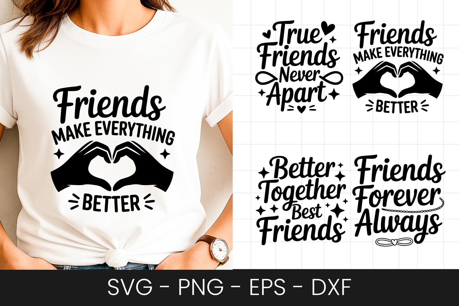 Friends Make Everything Better SVG PNG Perfect for crafters, designers, and DIY lovers, this design works beautifully with cutting machines and design software. Use this inspirational quote for greeting cards, invitations, scrapbooking, junk journals, party decor, t-shirts, mugs, wall art, stickers, and many other craft projects.
