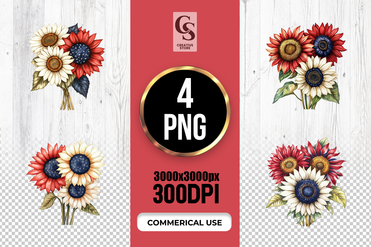 4 Patriotic Sunflower Bouquet Clipart Sublimation PNG Files Perfect for Greeting Cards, Invitations, Junk Journal, Party Decor, Scrapbooking and many other craft projects