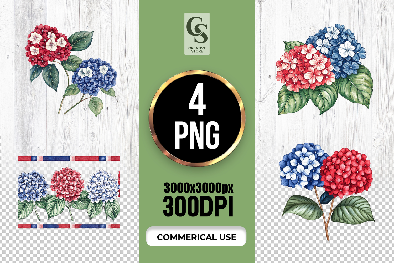 4 Patriotic Hydrangea Watercolor Clipart PNG Files Perfect for Greeting Cards, Invitations, Junk Journal, Party Decor, Scrapbooking and many other craft projects