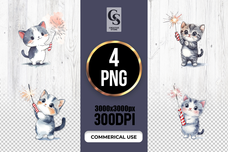 4 Cute Kitten Fireworks Watercolor Patriotic Clipart PNG Files Perfect for Greeting Cards, Invitations, Junk Journal, Party Decor, Scrapbooking and many other craft projects