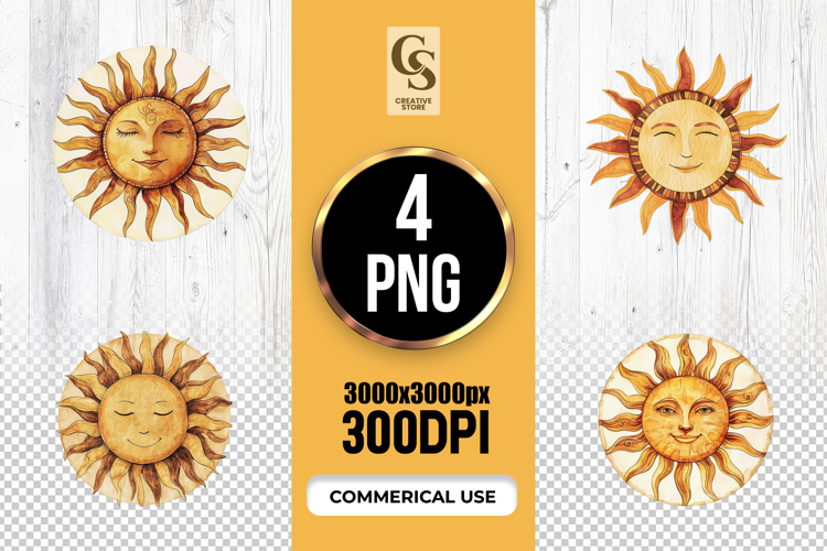 4 Watercolor Sun Face Celestial Boho Clipart PNG Files Perfect for Greeting Cards, Invitations, Junk Journal, Party Decor, Scrapbooking and many other craft projects