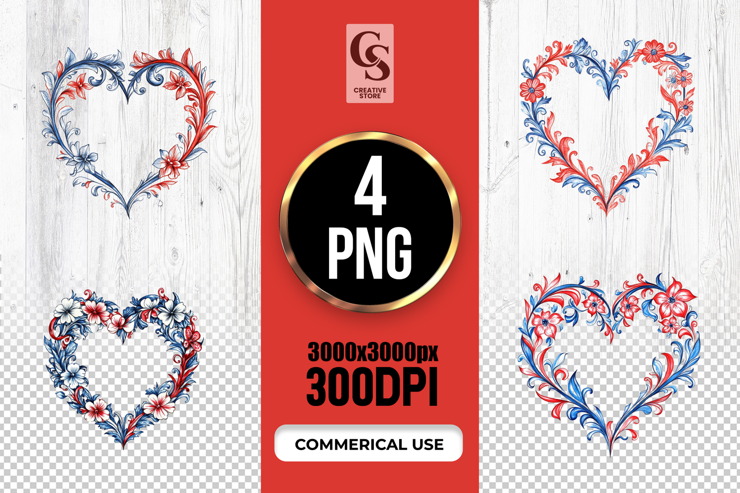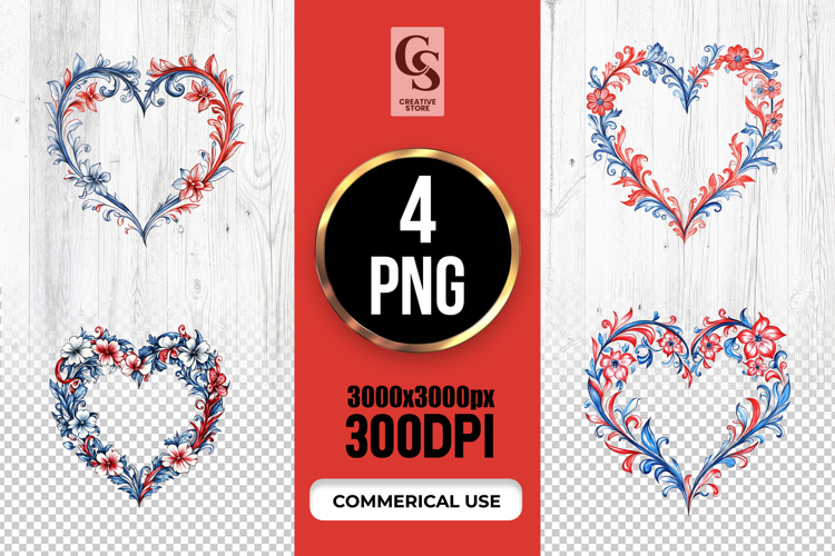 4 Watercolor Patriotic Floral Heart USA Red Blue Clipart PNG Files Perfect for Greeting Cards, Invitations, Junk Journal, Party Decor, Scrapbooking and many other craft projects