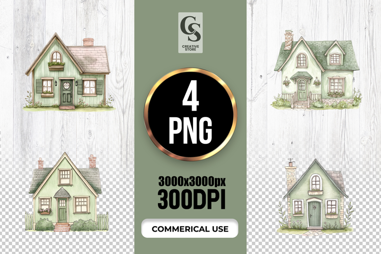 4 Cottage House Clipart PNG Files Perfect for Greeting Cards, Invitations, Junk Journal, Party Decor, Scrapbooking and many other craft projects