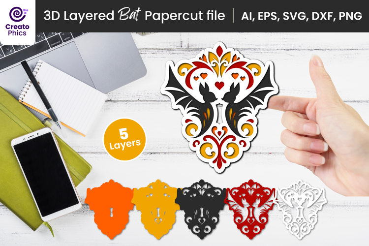 Create stunning, dimensional crafts with this 3D layered bat paper cutting SVG | decorative bat 3D papercut! Perfect for gothic themes, wall art, and spooky gifts, this intricate design adds depth and a colorful floral and decorative touch to your projects.