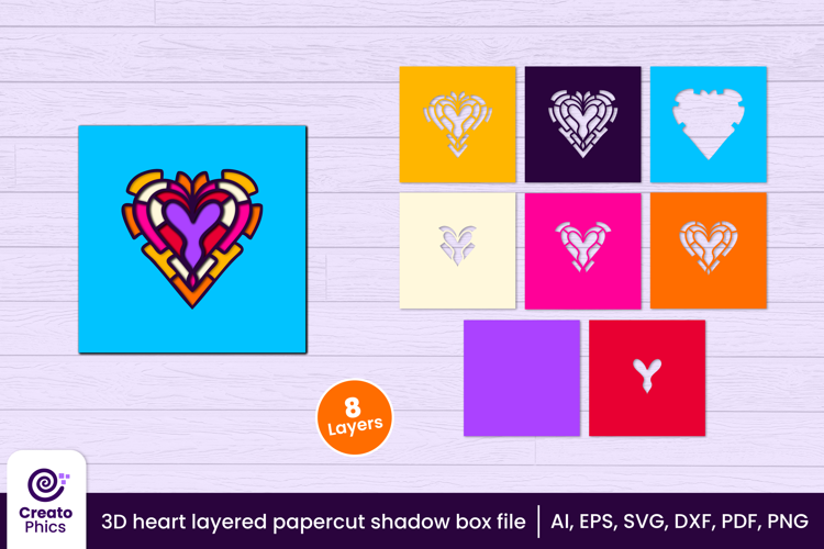 Create a beautiful sense of depth with this 3D layered heart papercut shadow box design, made exclusively for shadow box projects. Perfect for romantic décor, weddings, anniversaries, gifts, and meaningful keepsakes, this layered file is designed to produce a true dimensional shadow box effect and feel.