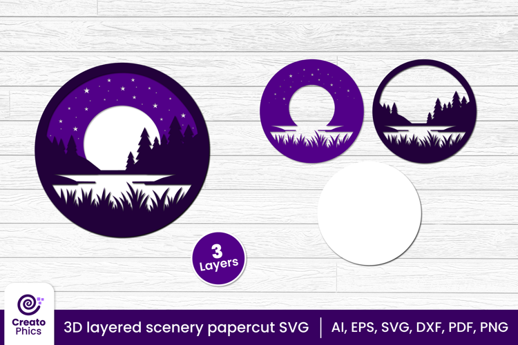 Bring the beauty of the outdoors into your creative projects with this 3D layered papercut moon scenery svg | purple night sky. Featuring natural elements and a tranquil nature-inspired design, this layered artwork is perfect for wall decor, shadow boxes, scrapbooking, or personalized gifts.
