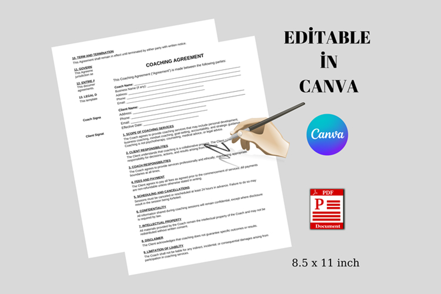An editable and printable, professional Coaching Agreement/Contract, New Client Registration Form Template. Easily customize it in Canva, download it instantly, and use it for your coaching or mentoring services. Perfect for confidently and professionally recruiting new clients.