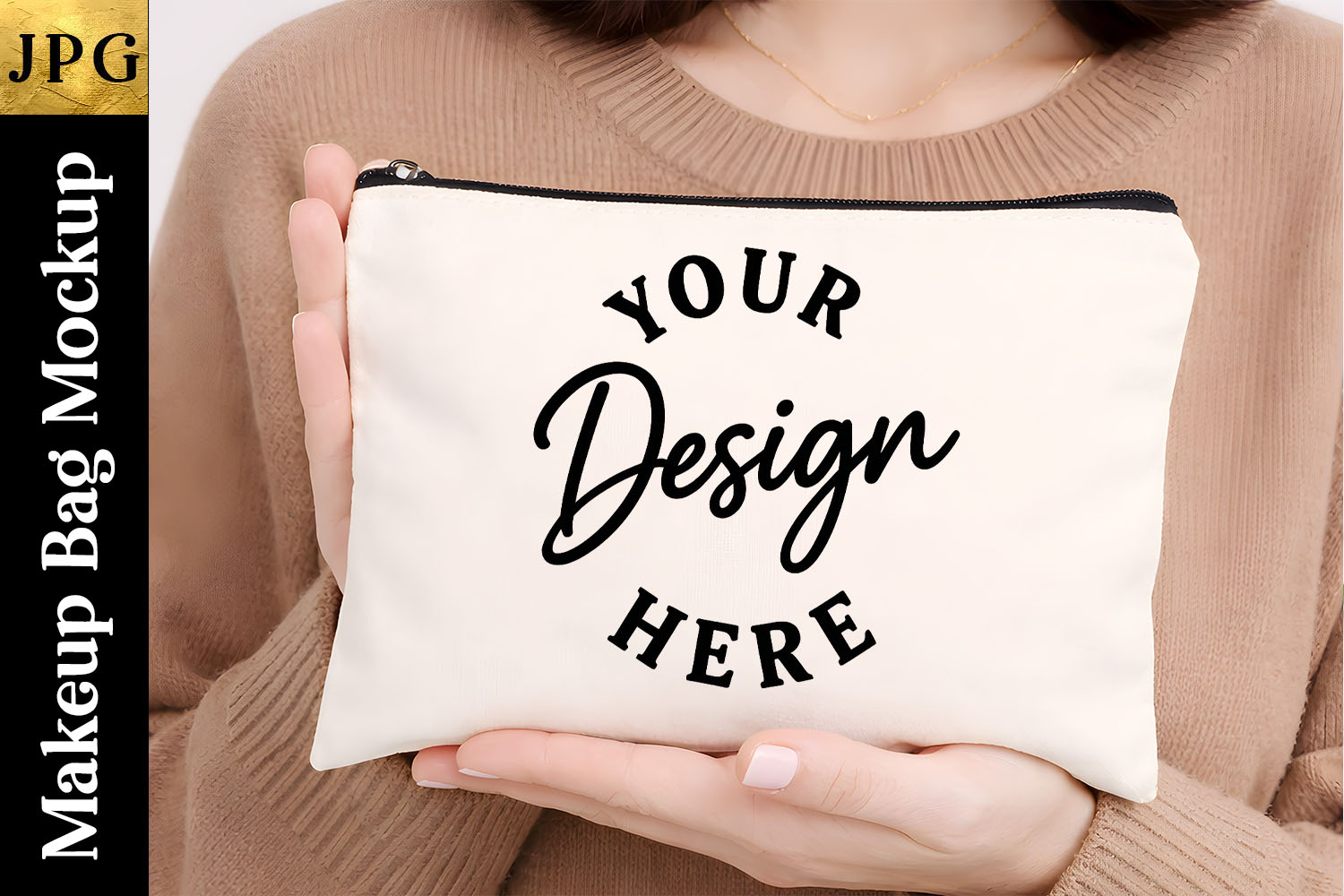 This mockup features a light-colored fabric pouch with a zipper, held in hands to provide real-life scale and a modern, feminine look. Ideal for listings, product presentations, social media, and digital shops.