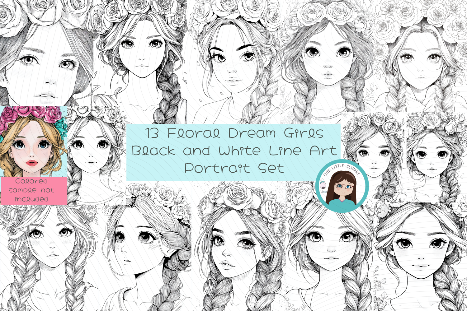 Unleash your creativity with this enchanting 13 Floral Dream Girls line art set! This collection features 13 beautifully hand-drawn black and white portraits of dreamy girls adorned with detailed rose crowns and elegant braided hairstyles. Each illustration combines delicate manga/anime-style aesthetics with intricate floral elements, making it ideal for a wide range of creative projects.